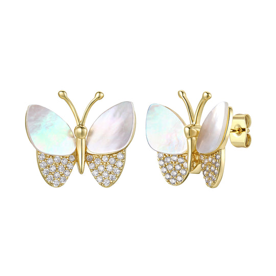 Elegant 14K Gold Plated Butterfly Stud Earrings Adorned with Mother of Pearl and Sparkling Cubic Zirconia for a Touch of Whimsical Sophistication