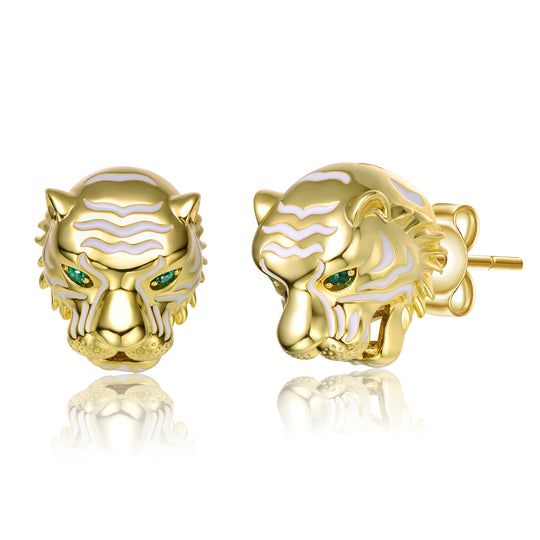 14k Yellow Gold Plated with Emerald Cubic Zirconia White Enamel Roaring Tiger Head 3D Stud Earrings