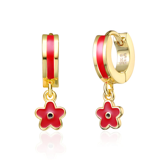 Charming 14k Yellow Gold Plated Red Enamel Dangle Flower Earrings for Kids with Delicate Floral Design and Secure Backing