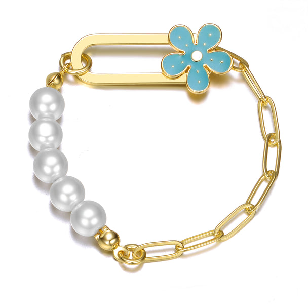 Kids 5.25" 14k Gold Plated Bracelet with Pearls and Enamel Flower Clasp