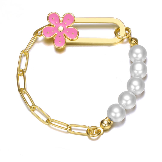 Kids 5.25" 14k Gold Plated Bracelet with Pearls and Enamel Flower Clasp
