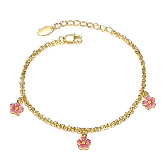 Kids Sterling Silver 14K Gold Plated Fuchsia-Pink & Yellow Enamel Daisy Charm Bracelet