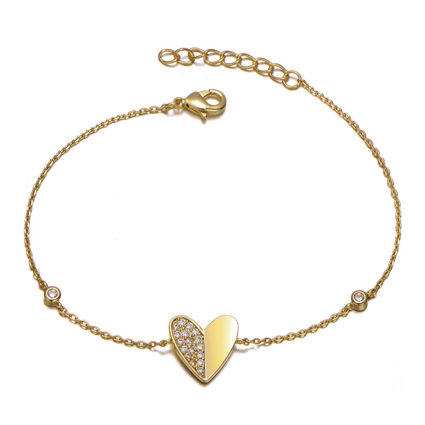 14k Gold Plated with Clear Cubic Zirconia Heart Station Charm Bracelet