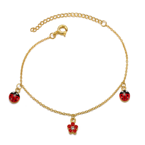 14k Gold Plated Red & Black Enamel Crystal Lady Bug & Flower Triple Charm Bracelet