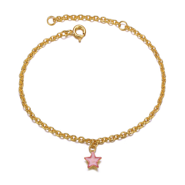 14k Gold Plated Pink Enamel Lucky Star Drop Charm Bracelet