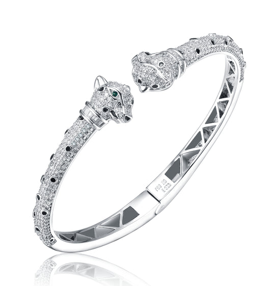 Elegant Rhodium Plated Panther Bangle Bracelet. This beautiful Cubic Zirconia bangle bracelet features many clear and black round shimmering Cubic Zirconias paved on the frame, making the perfect bangle bracelet. The open ends feature panther shape,...Regular price $179.98Quick view -