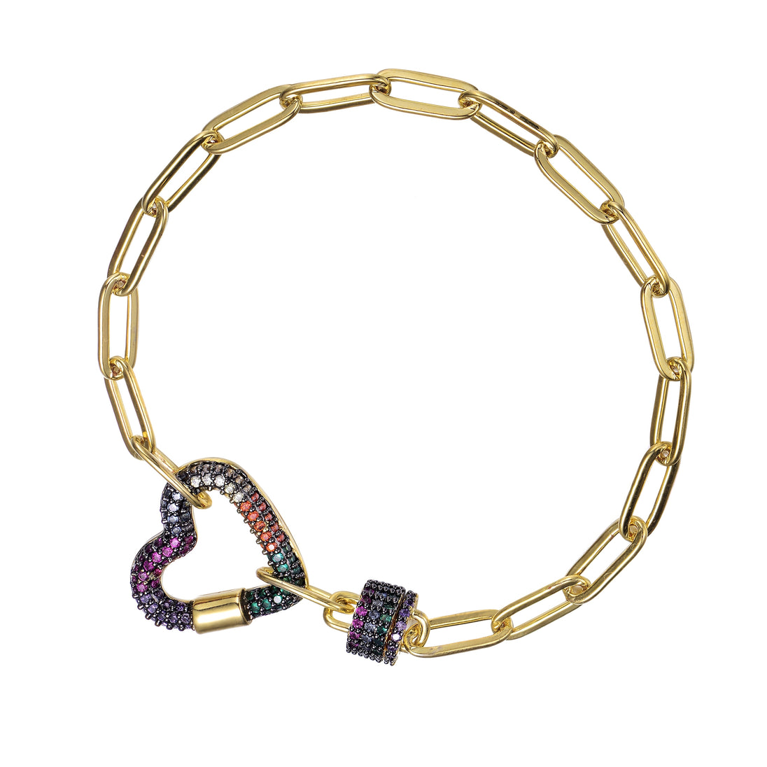 Elegant 14K Gold and Black Plated Paperclip chain bracelet. This item features large black plated heart and locket charms on one side. The charms are accented with small multicolored: pink, purple, orange, green, clear round cubic zirconia stones paved on the frames. The charm is connected to a paper clip chain on both sides. Crafted with 14K Gold and Black Plating and secure with a screw lock closure. Perfect piece of jewelry for all stylish combinations. The item also makes a sensational gift for a special birthday or occasion.