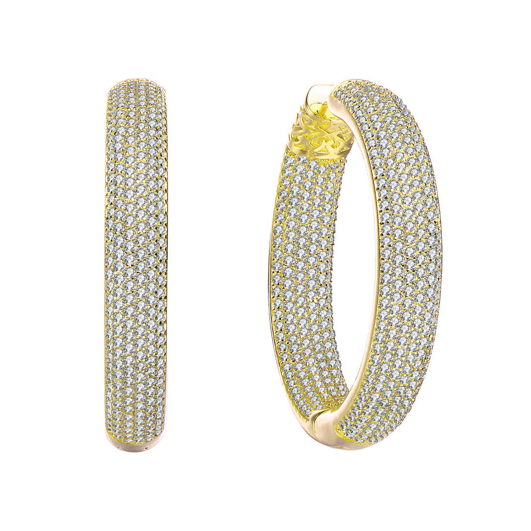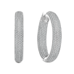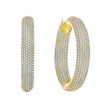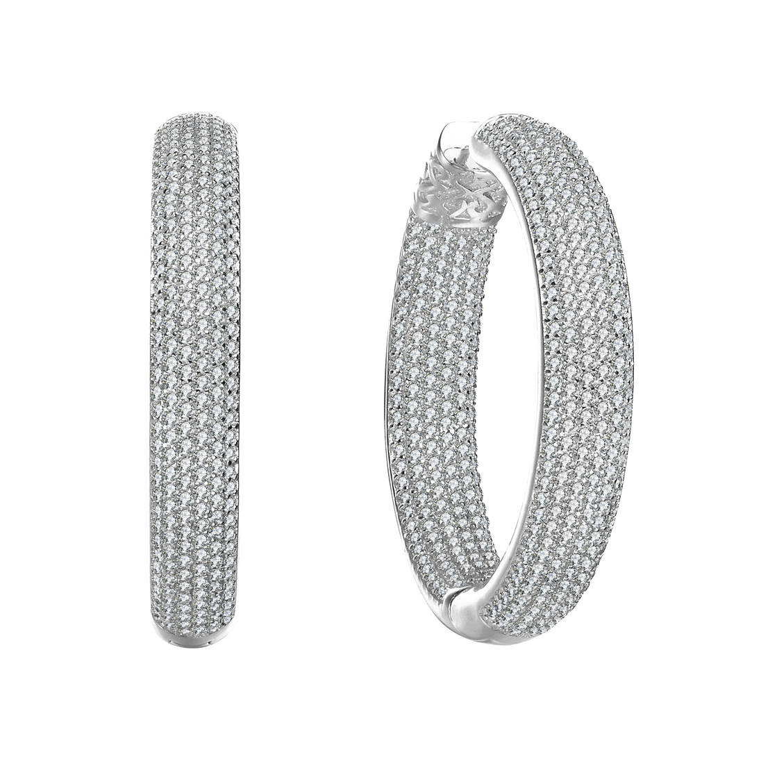 Very Stylish Hoop Earrings. These beautiful Simulated cubic zirconia stone hoop earrings feature many clear round shimmering simulated CZ's paved on the hoop frame, making the perfect hoop. Available in White Gold Plating, 14k Gold Plating, or 18k rose gold plating and secure with a Hinged post closure. Perfect piece of jewelry for stylish combinations. These also make a sensational gift for a special birthday or occasion.