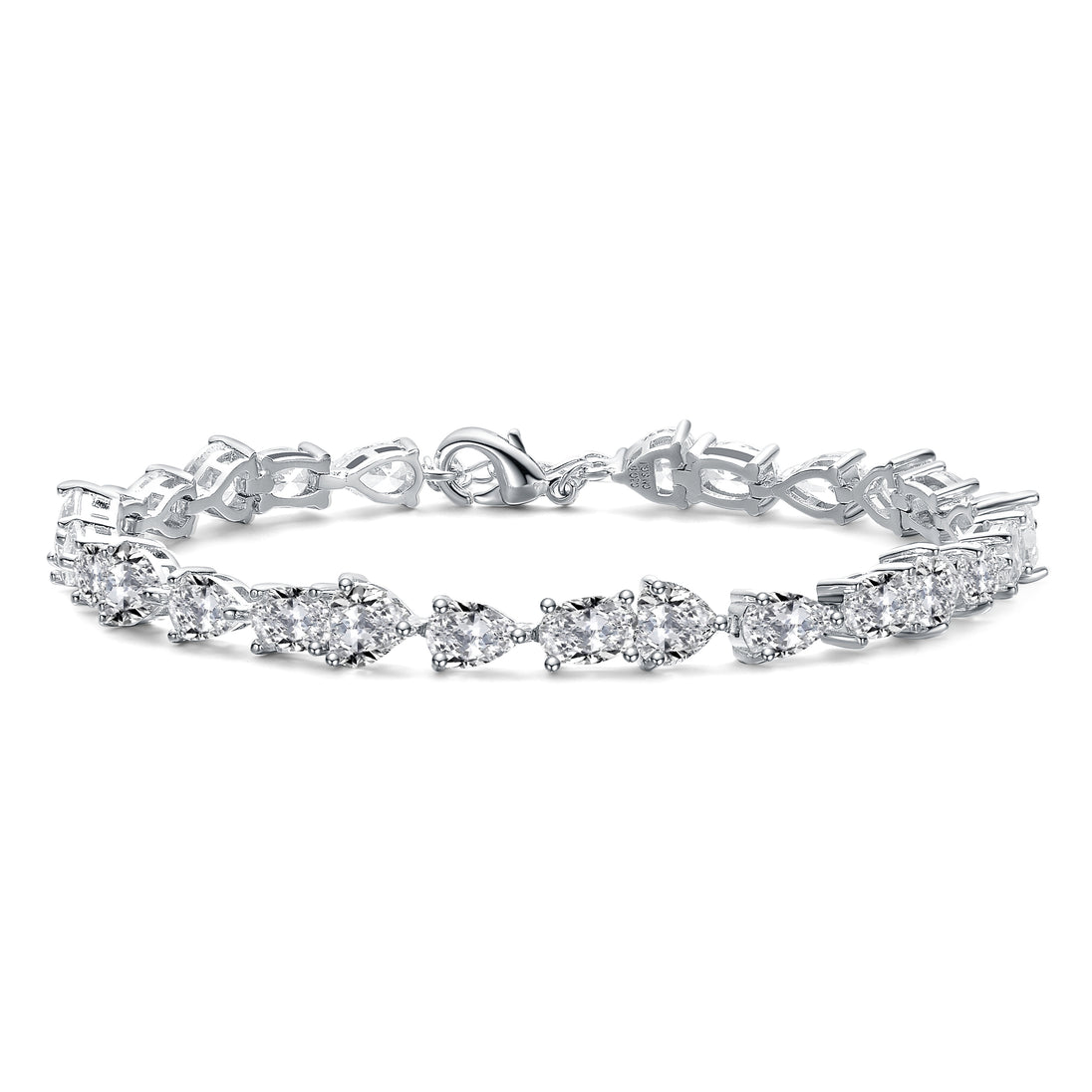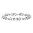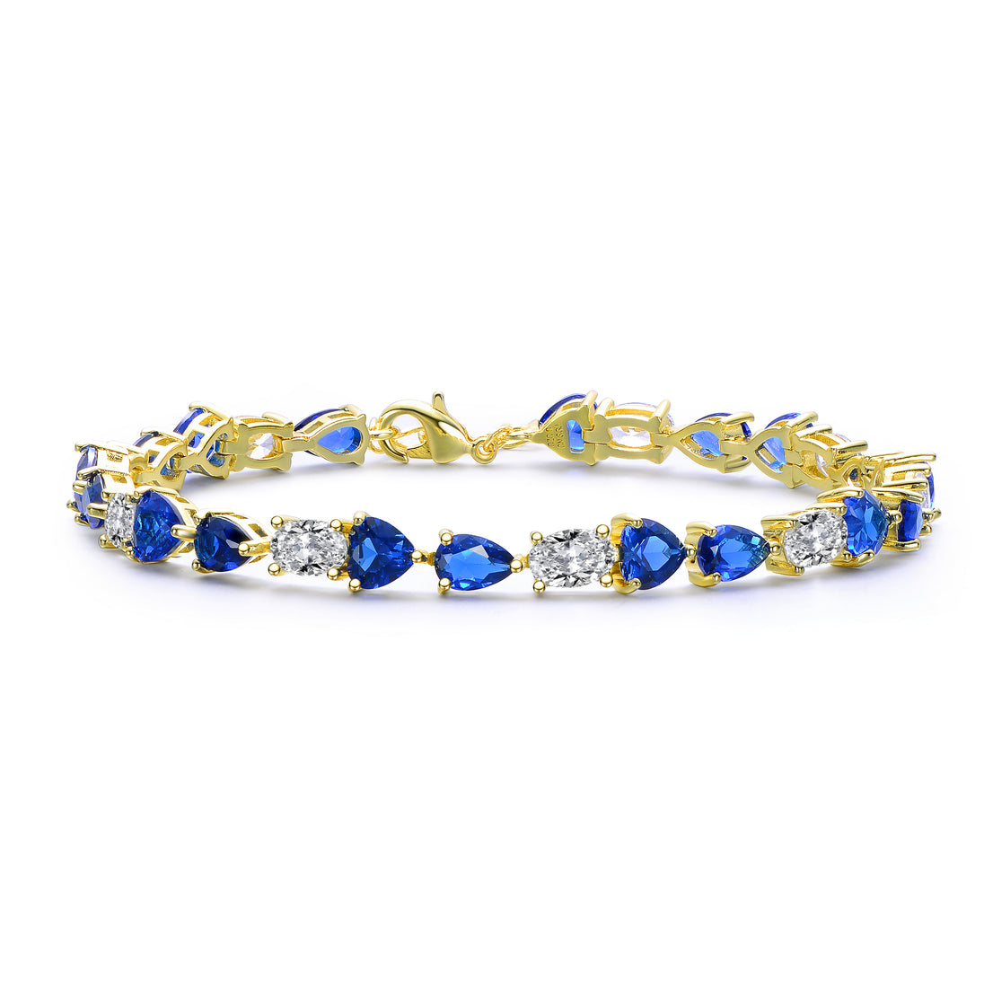 This elegant bracelet features a refined and sophisticated design with alternating cubic zirconia stones. The sequence includes heart-shaped sapphire cubic zirconia, pear-shaped sapphire cubic zirconia, and oval-shaped clear cubic zirconia stones in a precise and repeating pattern: heart, pear, oval; heart, pear, oval. Each stone is meticulously set in prong settings to enhance its brilliance and maximize light reflection. The bracelet is secured with a durable lobster clasp, ensuring both comfort and safety. Ideal for special occasions, memorable gifts, or a luxurious addition to your own collection, this bracelet exemplifies timeless elegance and superior craftsmanship.