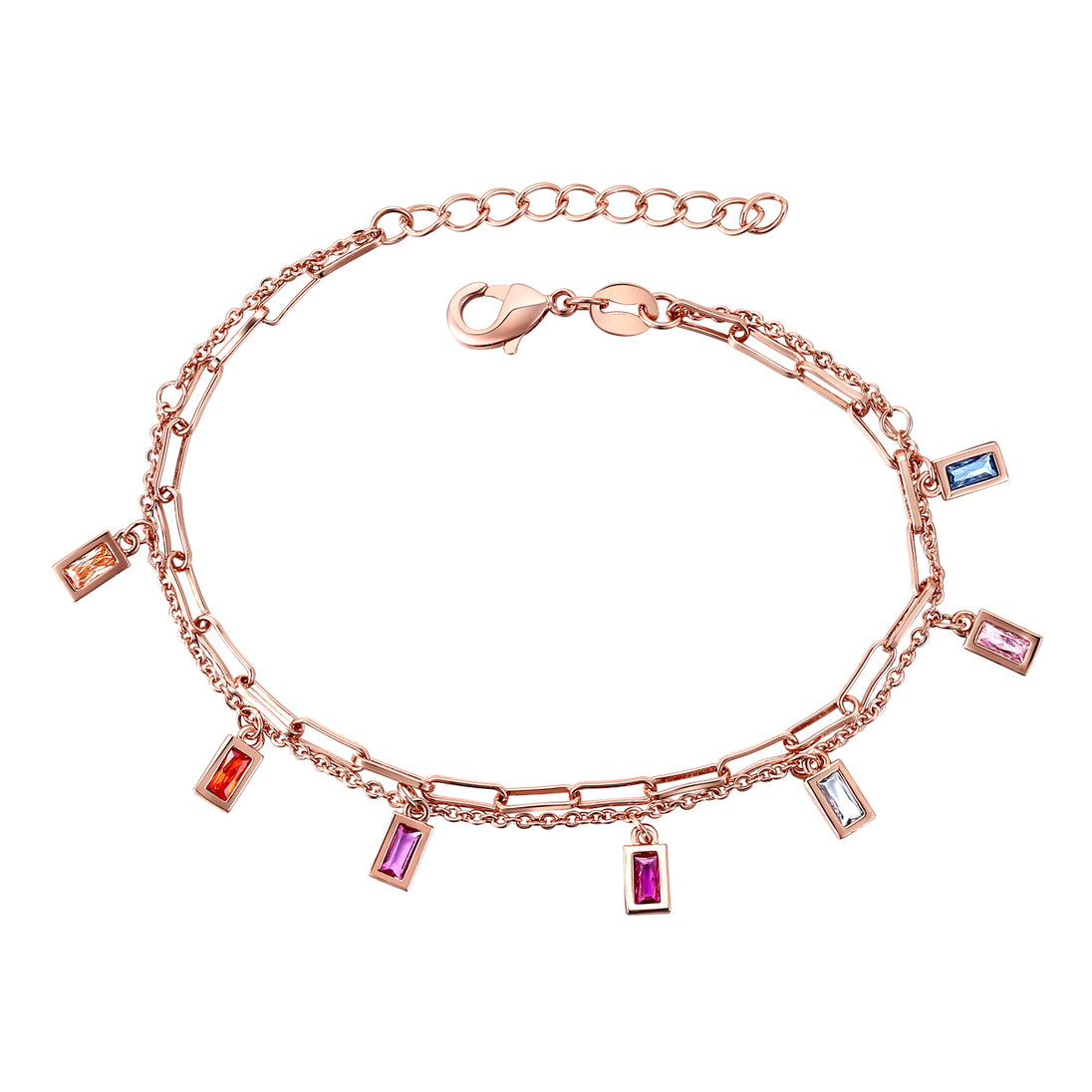 Colors collide on this adorable kids/teens charm bracelet, set in a beautiful pattern. Red, orange, yellow, white/colorless/, pink, blue, and purple baguette cubic zirconias dangle in bezel charms on a textured cable link chain. A lobster clasp and extension chain keep this enchanting bracelet secure, all finely crafted in 18k rose gold plating. This item is also available in 14k gold plating.