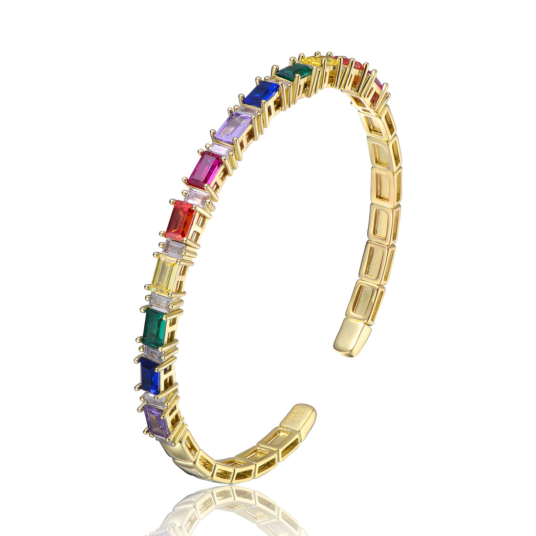 Discover a symphony of color with the Spectrum of Elegance 14k Gold Plated Bangle Bracelet. This exquisite piece showcases a stunning arrangement of multi-color cubic zirconia baguette stones, perfect for representing birthstones in shades of purple, blue, green, red, pink, and yellow. Between each vibrant baguette sits a clear baguette cubic zirconia set in a secure prong setting, adding a touch of sparkle and sophistication. Plated in radiant 14k gold, this bangle bracelet effortlessly combines elegance and contemporary style, making it an ideal accessory for any occasion or a thoughtful gift for someone special.