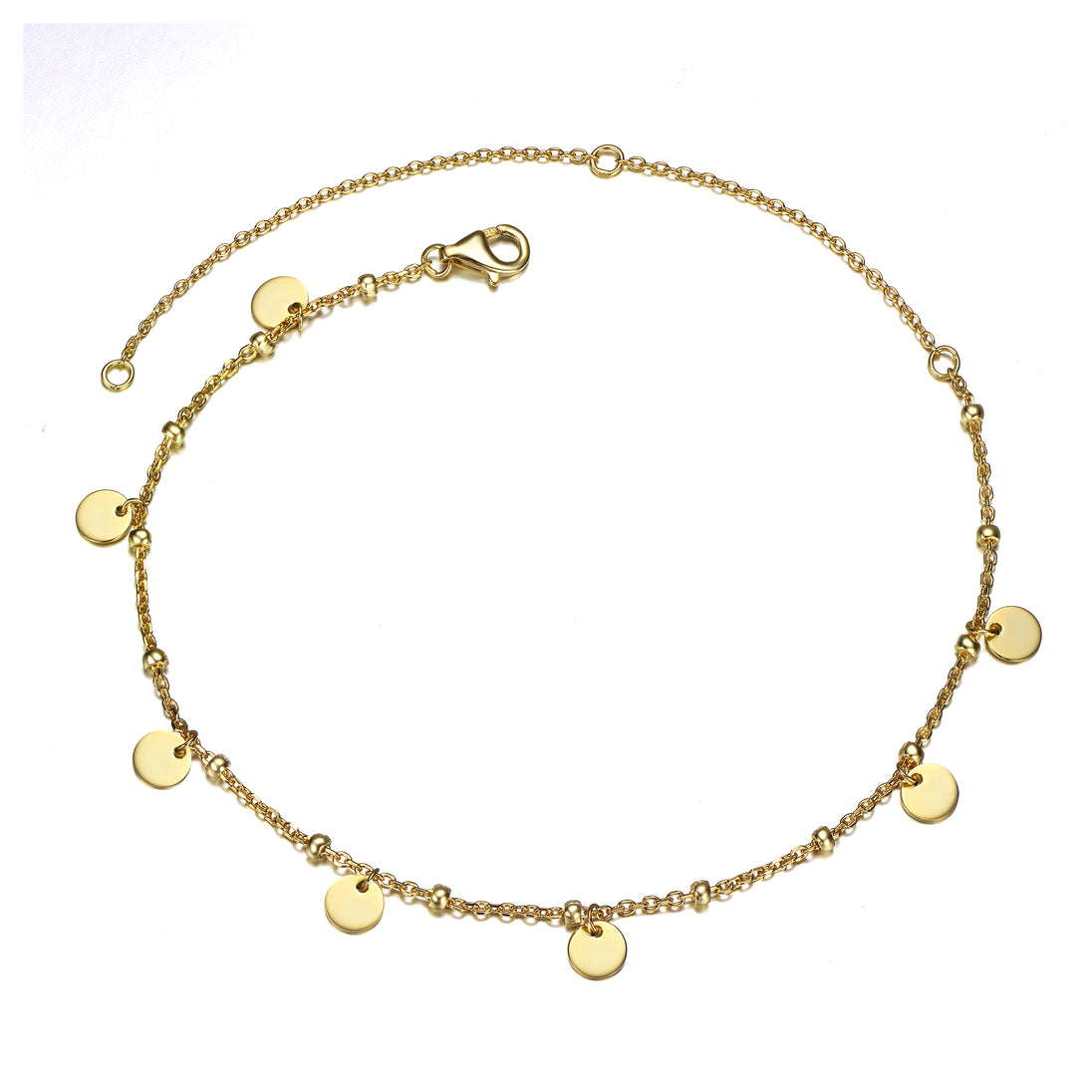 Sterling Silver 14k Gold Plated Circle Disc Dangle Charm Anklet, Adjustable Length. Add another layer of enchantment to your favorite summer outfit and year-round with this pretty bead link sterling silver anklet, all coated in a rich 14k gold plating for added shine, color, and durability. Eye-catching circle dangle charms sit in even intervals on a cable rolo chain, bringing all the attention to you with their graceful movement. A lobster clasp and extension chain accommodate most lengths.