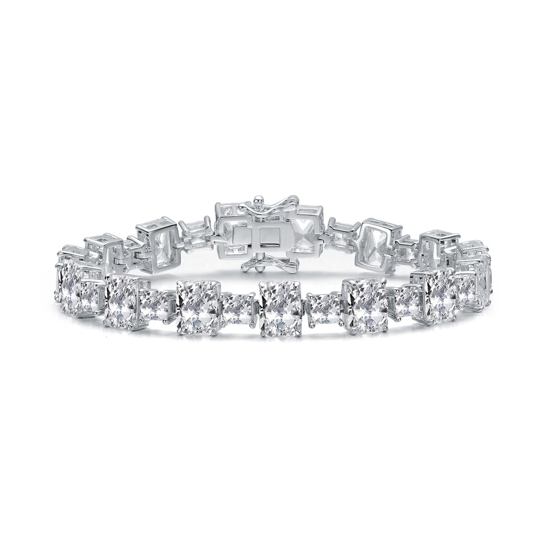 Sterling Silver White Gold Plated with Clear Cubic Zirconia Statement Bracelet. This exquisite bracelet makes a bold entrance, crafted in sterling silver and luxuriously plated in white gold. A dazzling sequence of large, emerald & square cubic zirconia stones takes center stage, flanked by accents of princess & asscher-cut stones for added brilliance. Each cz is expertly prong-set in a sculpted silhouette that catches the light from every angle. The secure clasp melts into the structured design, offering seamless sophistication. Perfect for elegant evenings or a bold touch of daytime glamour, this bracelet is a radiant fusion of timeless shapes and modern elegance.