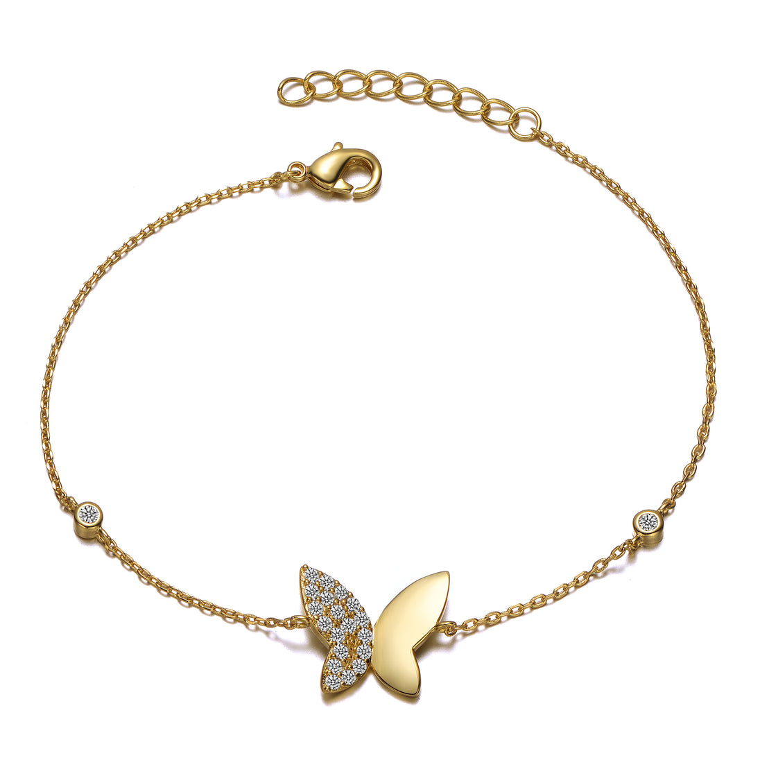 Embrace elegance and charm with this exquisite 14k gold plated butterfly bracelet, perfect for both teens and women. The center of this bracelet showcases a beautifully crafted gold butterfly, flanked by two sparkling cubic zirconia stones. This delicate design is completed with a secure lobster clasp, offering adjustable and comfortable wear. Ideal for adding a touch of sophistication to any outfit, this bracelet makes a wonderful gift for any occasion.